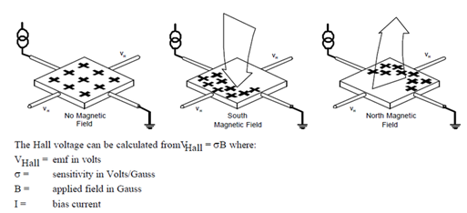 - InSb(Indium Antimonide 인듐안티몬), GaAs(Gallium Arsenide 갈륨비소), Si(Silicon 규소) 등을 이용해 만든 반도체 중에서, 수직자계가 Hall plate에 인가되면 자기장내에서 전하가 한쪽으로 치우치면서 전위차가 발생하는데 이를 Hall effect라고 한다.