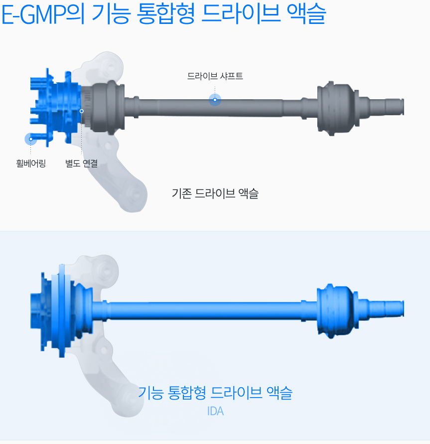 E-GMP는 기능 통합형 드라이브 액슬(IDA, Integrated Drive Axle)을 세계 최초로 양산 적용했다. 기존에는 드라이브 샤프트와 휠 베어링을 마치 볼트와 너트처럼 연결해 엔진 또는 모터에서 발생한 동력을 바퀴로 전달했다. 그러나 IDA는 드라이브 샤프트와 휠 베어링을 일체화 했다. 2개 이상이던 부품이 하나로 통합되자 부품 사이에 연결 부위가 사라져 강성이 약 42% 높아졌고, 부품 수가 줄어 무게는 약 10% 줄었다. E-GMP에 기반한 전기차가 승차감과 핸들링 성능을 향상시킬 수 있는 비결이다.