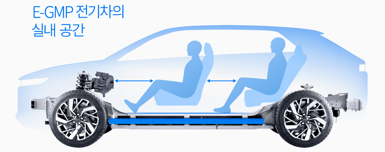 이런 구조적인 차이는 실내 공간의 구성도 바꾼다. 휠 베이스가 길어져 비슷한 크기의 기존 자동차보다 실내 공간이 훨씬 넉넉하다. 또한, 차체 하단을 지나가는 구동축이 없기 때문에 실내 바닥이 편평하다. 공간의 제약 없이 시트를 자유롭게 배치할 수 있어 탑승자의 자동차 이용 습관이나 라이프 스타일에 맞춘 설계가 가능하다는 것도 E-GMP의 특징이다.