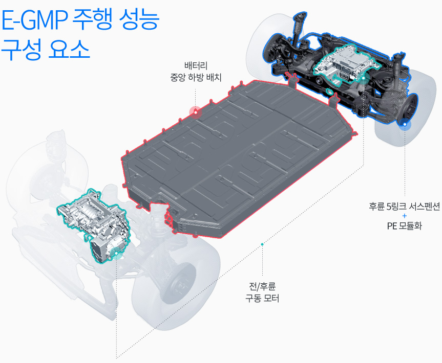E-GMP를 바탕으로 하는 전기차는 저중심 설계를 적용해 세단, SUV, CUV, 고성능차 등 차종에 관계없이 직진 가속 및 코너링, 승차감 등 전반적인 주행 품질이 우수하다.