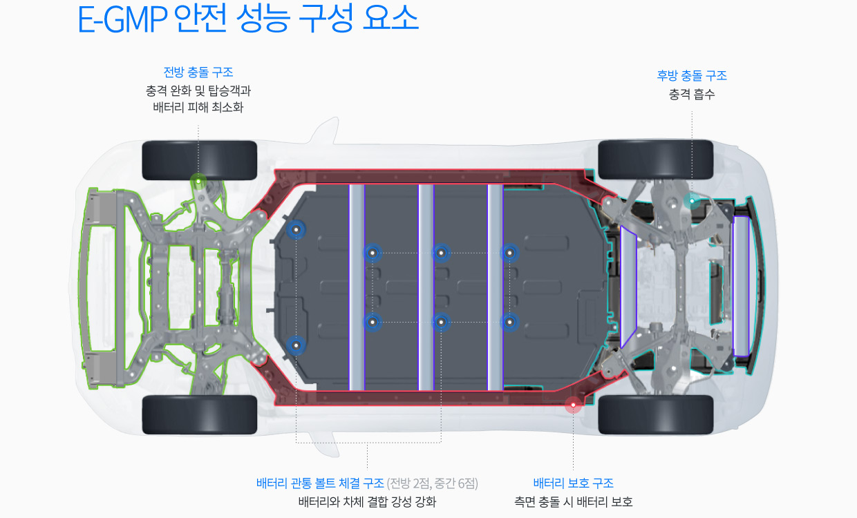 E-GMP는 내연기관 자동차와 차별화된 구조를 채택해 안전 성능까지 향상됐다. 여유가 생긴 차체 앞쪽 공간에 프레임과 서브프레임 보강 구조를 적용해 다중골격 구조를 완성한 것이다. 이를 통해 전방 충돌 시 차체 구조물이 효과적으로 변형해 충격을 완화하고 탑승객과 배터리가 입는 피해를 최소화한다. 후방 충돌에 대비하기 위해서는 범퍼 부위에 변형을 유도하는 구조물을 적용해 충격이 분산되도록 했다. 동시에 후륜과 뒷좌석 탑승객을 적극적으로 보호하기 위해 차체 안쪽에 변형 방지 보강 구조를 추가했다.