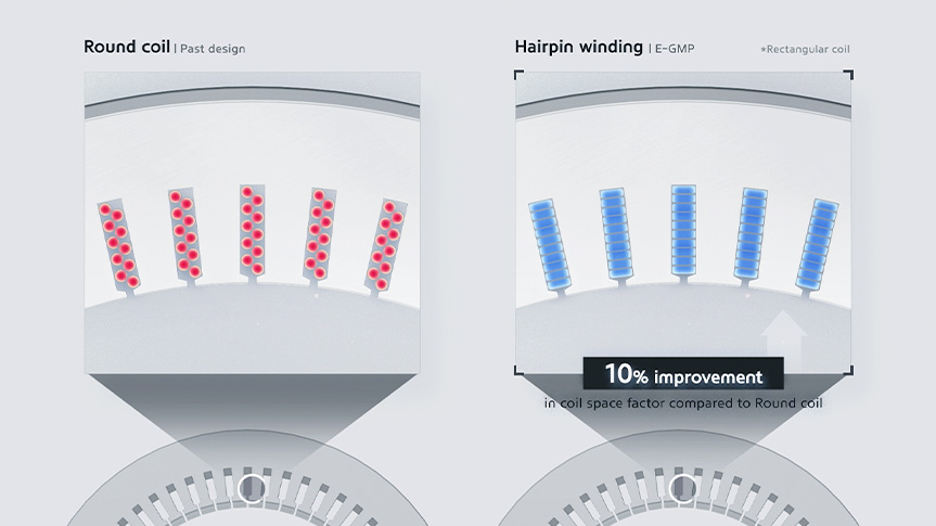 헤어핀 권선 기술은 말 그대로 헤어핀의 형상을 닮은, 직사각형의 단면을 가진 코일을 활용한 구조를 뜻한다. 단면이 사각형인 코일은 기존의 원형(환선) 코일 대비 고정자에 코일을 더 촘촘하게 감을 수 있고, 이를 통해 권선 저항을 줄여 효율을 높일 수 있다. 원형의 코일 대비 높아진 점적률(일정 공간에서 유효한 부분의 면적이 차지하는 비율)은 기존보다 약 10%의 효율을 개선하는 효과가 있다.