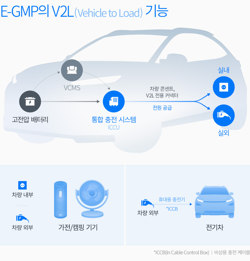E-GMP의 V2L 기능이 제공하는 최대 공급 전력은 주택용 계약 전력(한국전력공사와 어느 정도의 전기를 쓸지 계약하고 이에 맞게 공급받는 전력) 3kW보다 많은 3.5kW다. 덕분에 E-GMP 기반의 전기차는 220V 완속 충전이나 캠핑장 등에서 가전용 전자제품을 아무런 불편함 없이 쓸 수 있는 양방향 전력 사용이 가능하고, 비상 시에는 외부 전력원으로도 활용할 수 있다. 뿐만 아니라 E-GMP 기반의 전기차는 비상용 충전 케이블(ICCB : In-Cable Control Box)을 사용해 다른 전기차의 배터리를 완속으로 충전하는 등 활용 범위가 넓다.
