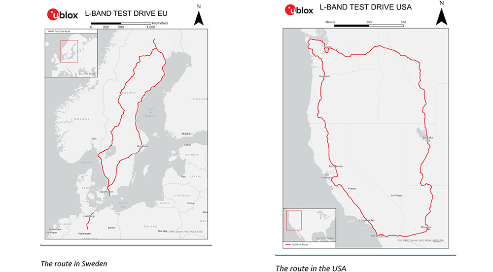 이 테스트를 위해서 위성 신호 수신이 까다로운 지역들을 지나도록 경로를 구성했다. 스웨덴 북부의 북극권 지역으로 들어가서 하늘의 위성 고도가 매우 낮을 때 신호 수신이 충분한지를 테스트했다. 이 테스트 경로에서 가장 북쪽 지점인 북위 66°에서 위성 고도는 16°로 낮아졌다. 참고로 헬싱키에서는 21.8°이고, 로마에서는 40°이다. 또한 커버리지가 미치는 지역에서도 환경 조건이 까다로운 지역에 들어가 이러한 환경에서 신호 강도가 충분한지 확인했다. 예를 들면, 캘리포니아주 남동부의 넓은 사막 지역, 워싱턴주의 산악 지역, 시애틀과 샌디에이고의 도심 지역에서 각각 테스트를 실시했다. 도심 지역에서는 빽빽하게 들어선 빌딩 숲이 위성 신호 수신에 영향을 미칠 수 있다. 아래 지도에서 이 두 테스트 경로를 볼 수 있다.