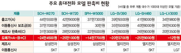 ■ 이통사 이어 제조사까지 지난 6월 중 하루에 1000대 이상 개통된 휴대전화 모델은 모두 26개로, 삼성전자 13개, 엘지(LG)전자 10개, 팬택 3개 등이다. 12일 < 한겨레 > 가 입수한 한 대형 이통사 대리점의 '가격 정책표'를 보면, 이 가운데 이통사와 제조사가 지원하는 판촉비를 합치면 실제 출고가격보다 더 많은 이른바 '마이너스폰'이 모두 18개로 전체의 70%에 이른다. 마이너스폰은 제품 가격보다 더 많은 판촉비가 지원되기 때문에, 이론적으론 소비자가 휴대전화를 살 때 되레 돈을 받아야 한다는 얘기가 된다.